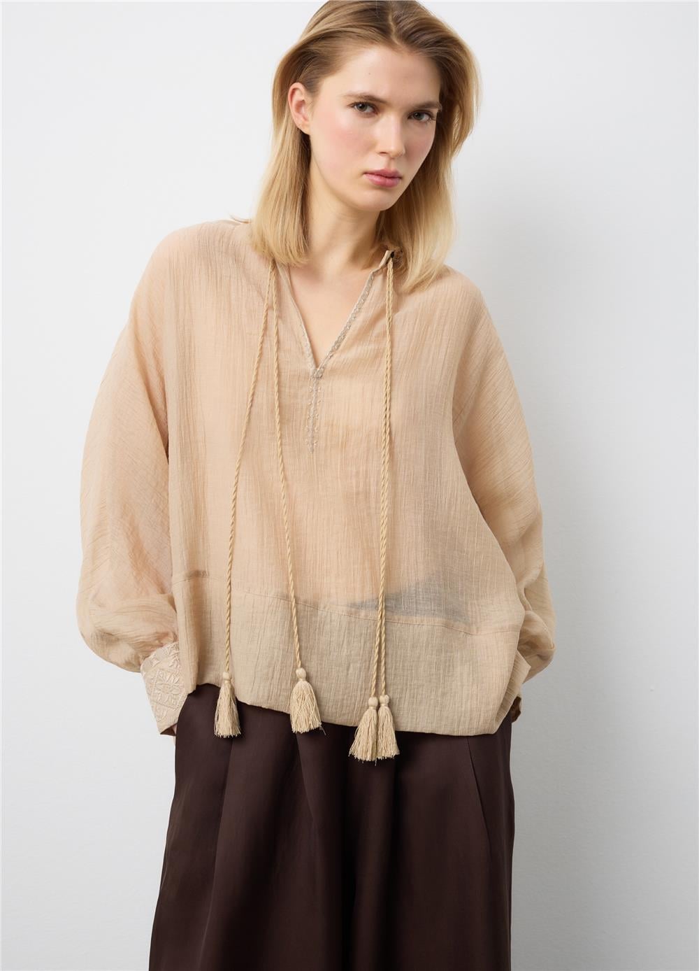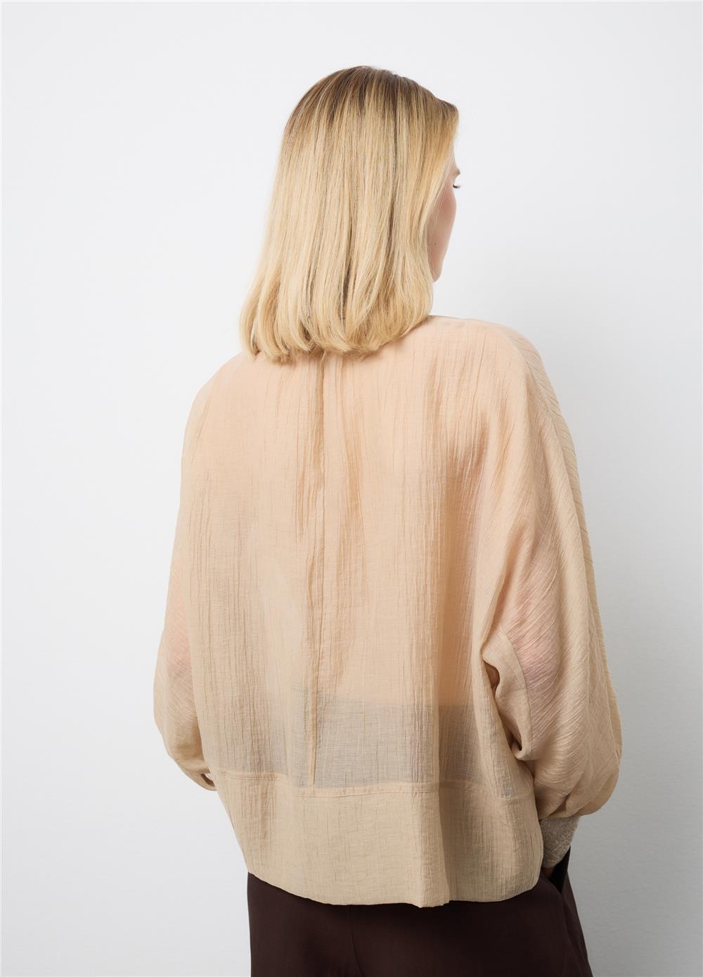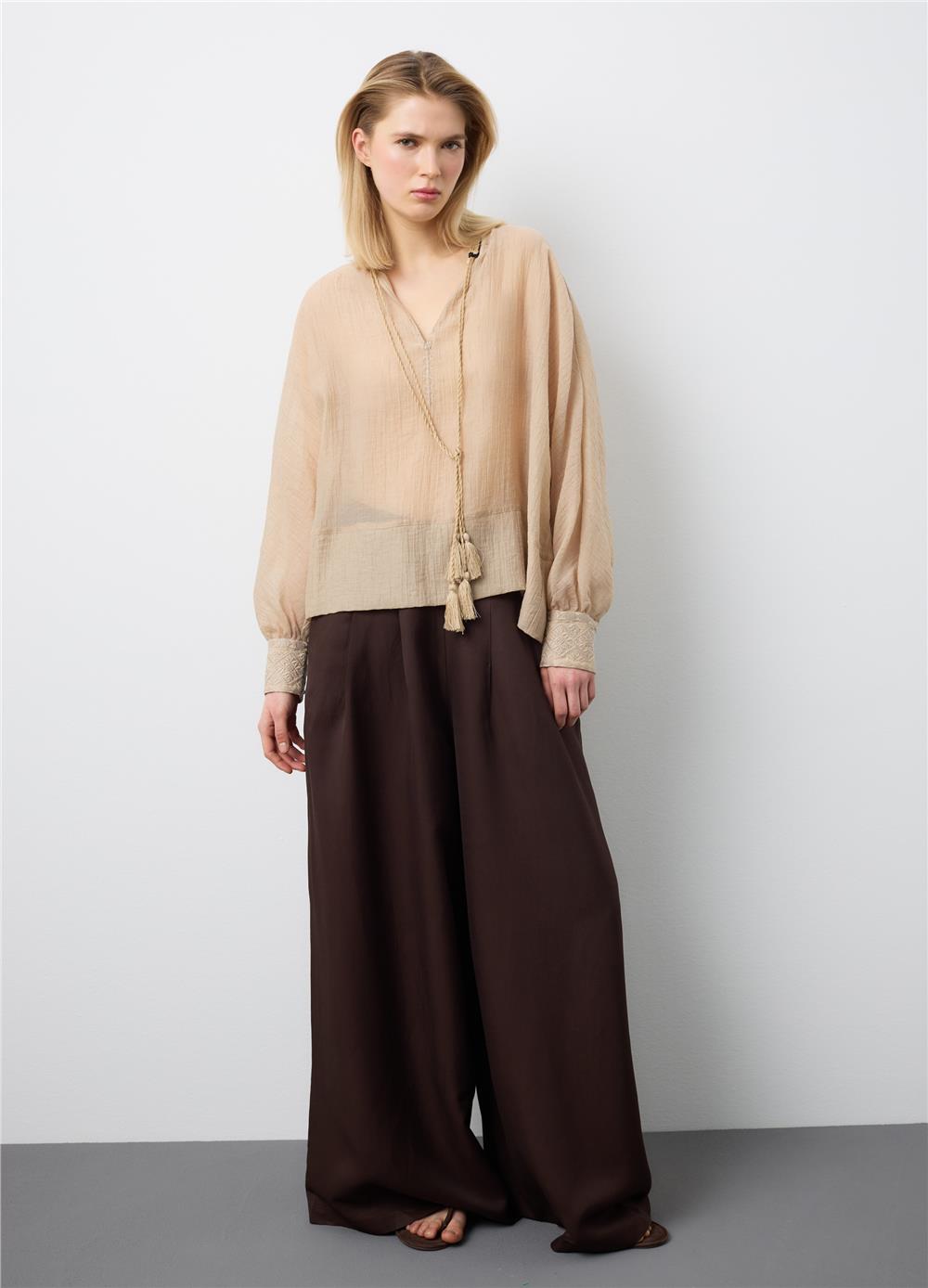 Bej renkli bluz, rahatlık ve şıklığı bir arada arayanlar için ideal olan lyocell karışımından üretilmiştir. Mandarin yakalı ve uzun kollu olan bluz, her vücut tipini vurgulayan normal bir kesime sahiptir. Hafif ve nefes alabilen kumaş, tasarıma sofistike bir dokunuş katan şeffaf bir doku sergiler. İlkbahar ve yaz günleri için ideal olan bu bluz, çeşitli kıyafetlerle kombinlenebilecek çok yönlü bir parçadır.