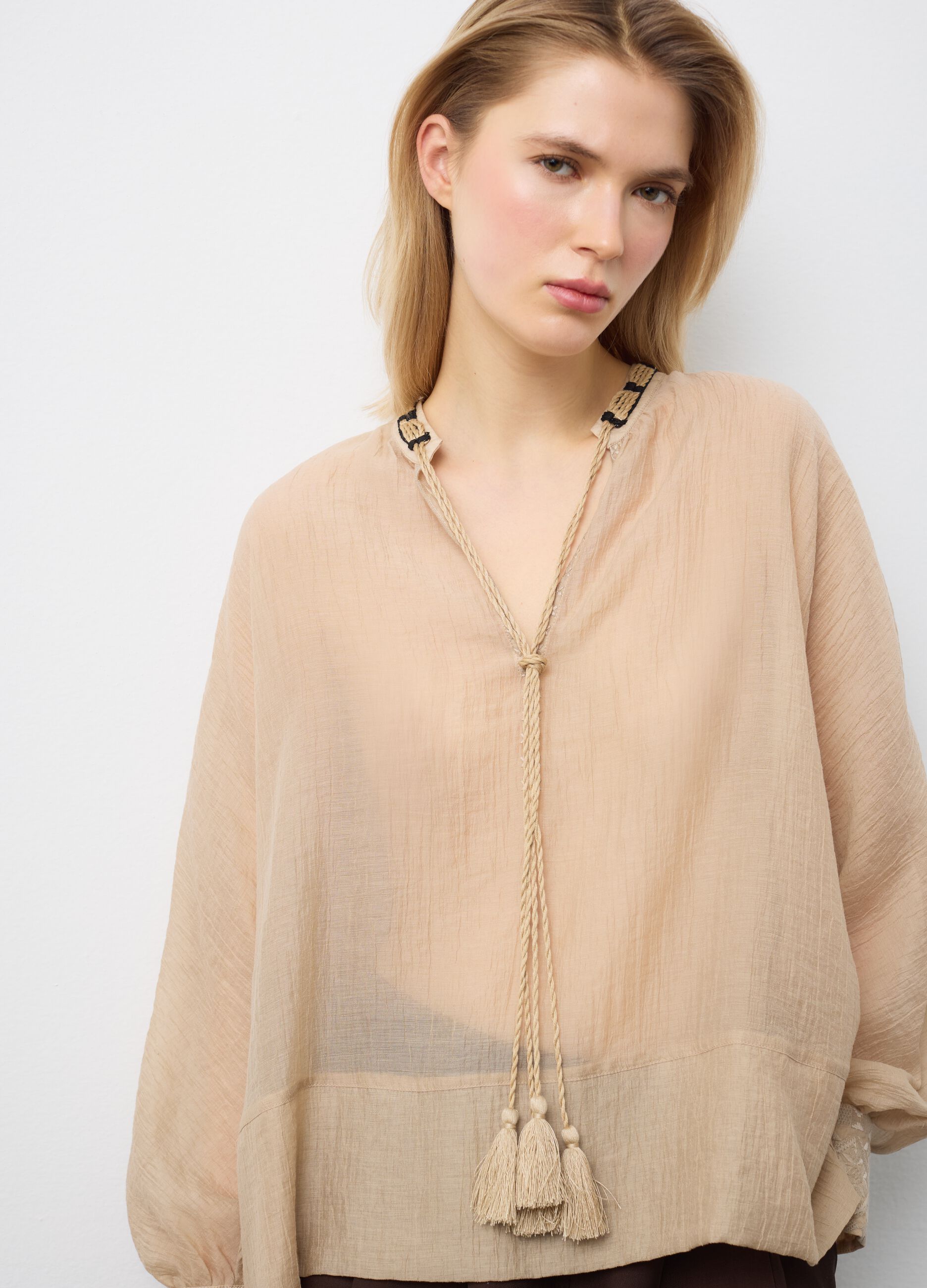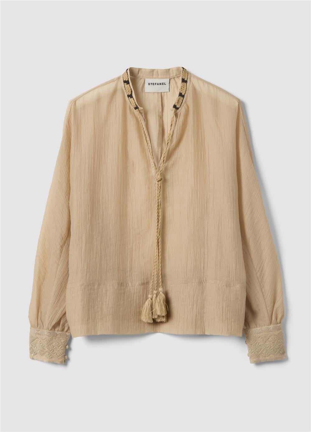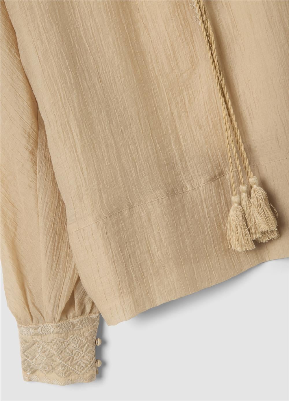 Bej renkli bluz, rahatlık ve şıklığı bir arada arayanlar için ideal olan lyocell karışımından üretilmiştir. Mandarin yakalı ve uzun kollu olan bluz, her vücut tipini vurgulayan normal bir kesime sahiptir. Hafif ve nefes alabilen kumaş, tasarıma sofistike bir dokunuş katan şeffaf bir doku sergiler. İlkbahar ve yaz günleri için ideal olan bu bluz, çeşitli kıyafetlerle kombinlenebilecek çok yönlü bir parçadır.