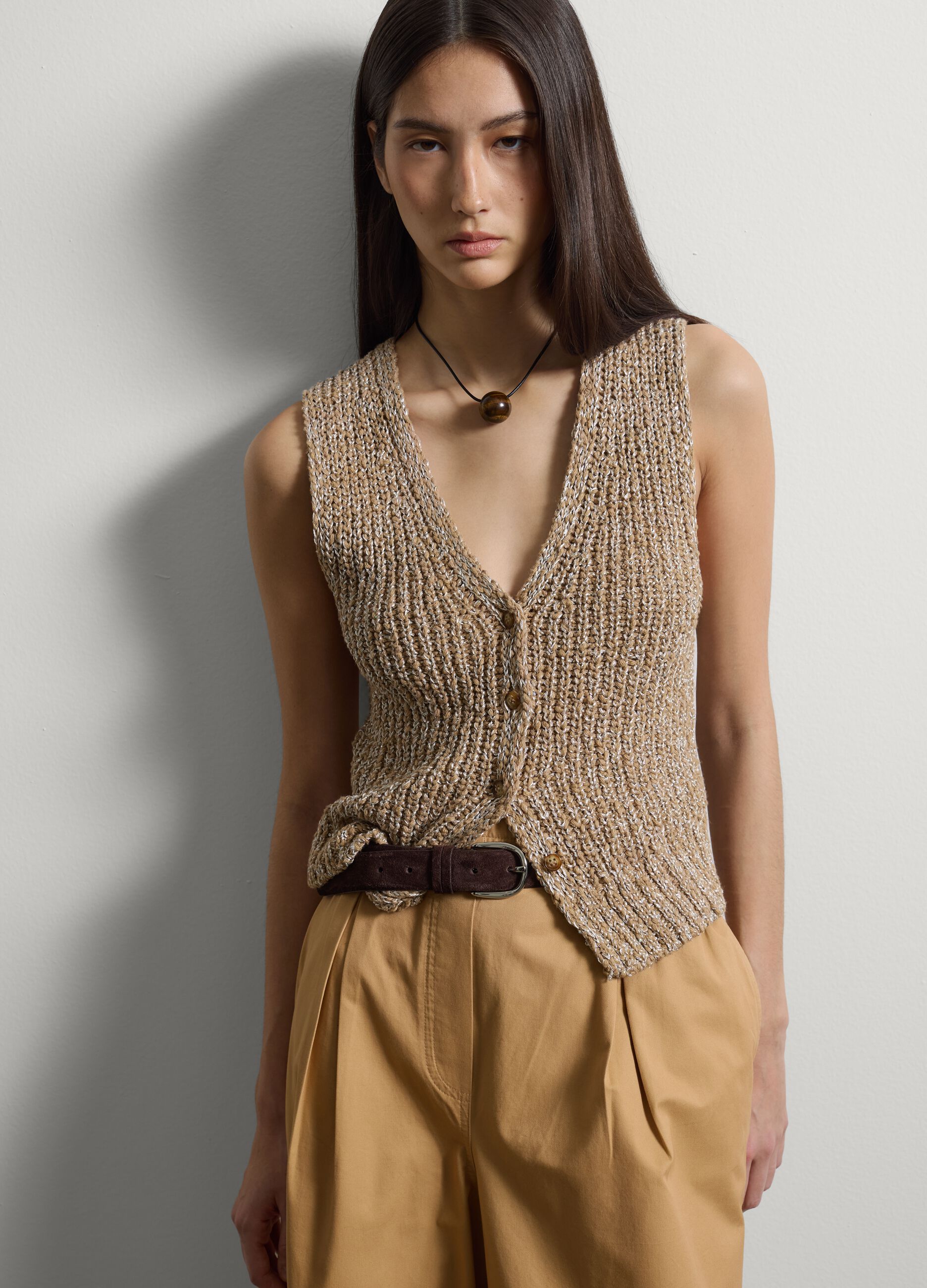 Pamuk karışımından üretilen bej renkli bluz, ilkbahar ve yaz mevsimleri için mükemmel, çok yönlü ve rahat bir giysidir. Normal kesimi ve örgü tasarımı, her türlü etkinlik için idealdir. Bej rengi, çeşitli kıyafetlerle kolayca uyum sağlayarak kadın gardırobunun olmazsa olmazlarından biri haline gelir. Düğmeli kapanış, pratiklik ve şıklık katmaktadır.