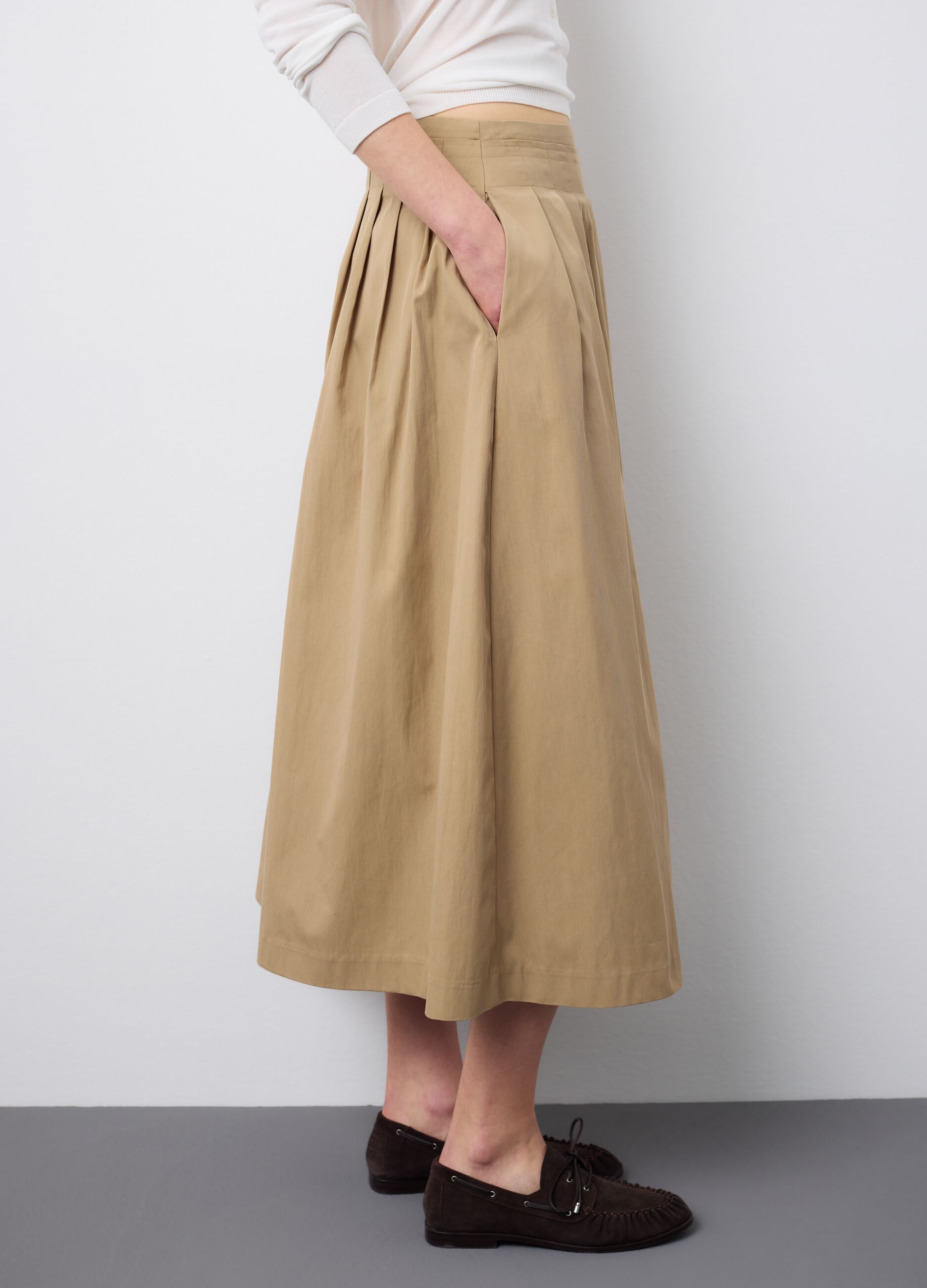 Yüksek kaliteli pamuk karışımından üretilen bej midi etek, ilkbahar ve yaz ayları için çok yönlü bir parçadır. Yapılandırılmış beli ve zarif pileleriyle gardırobunuza sofistike bir dokunuş katıyor. Hem günlük hem de resmi etkinlikler için mükemmel olan bu etek, farklı ayakkabı ve bluz türleriyle uyumlu midi boyuyla rahatlık sağlıyor. Şıklığı ve kullanışlılığı birleştirmek isteyen her kadın için olmazsa olmaz bir parça.