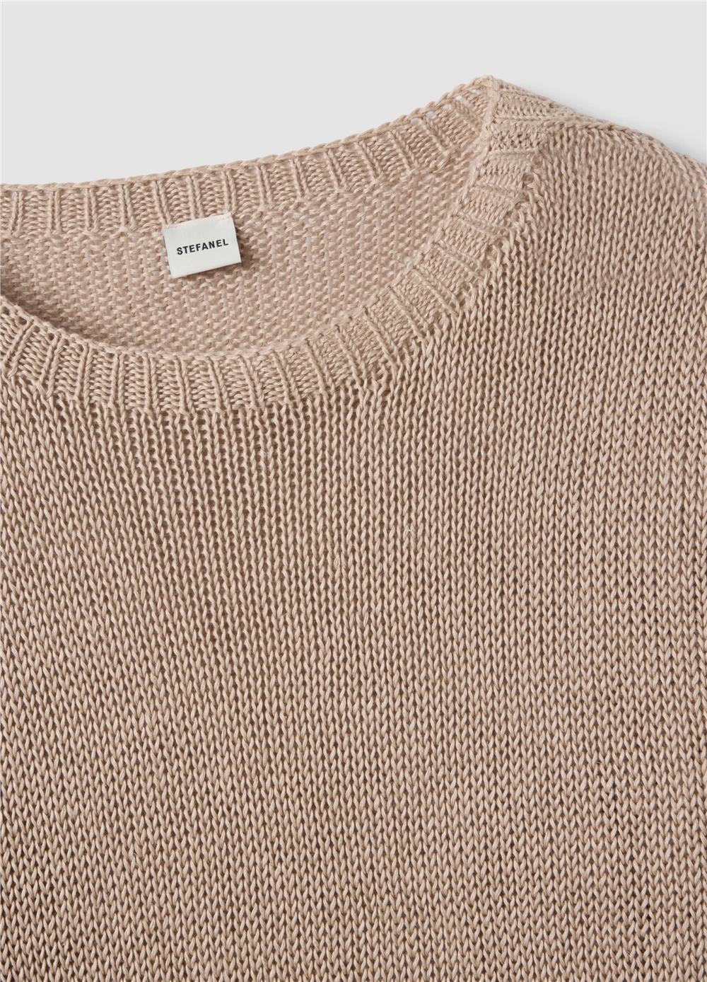 Bej renkli kazak, ilkbahar ve yaz mevsimleri için mükemmel olan saf ketenden üretilmiştir. Normal kesimi ve düğmesiz tasarımı, rahat ve günlük bir görünüm sağlar. Yuvarlak yakası ve uzun kollarıyla serin günler için idealdir. Jersey örgü kumaşı yumuşaklık ve konfor sunarak şık bir kombin oluşturmayı kolaylaştırır.