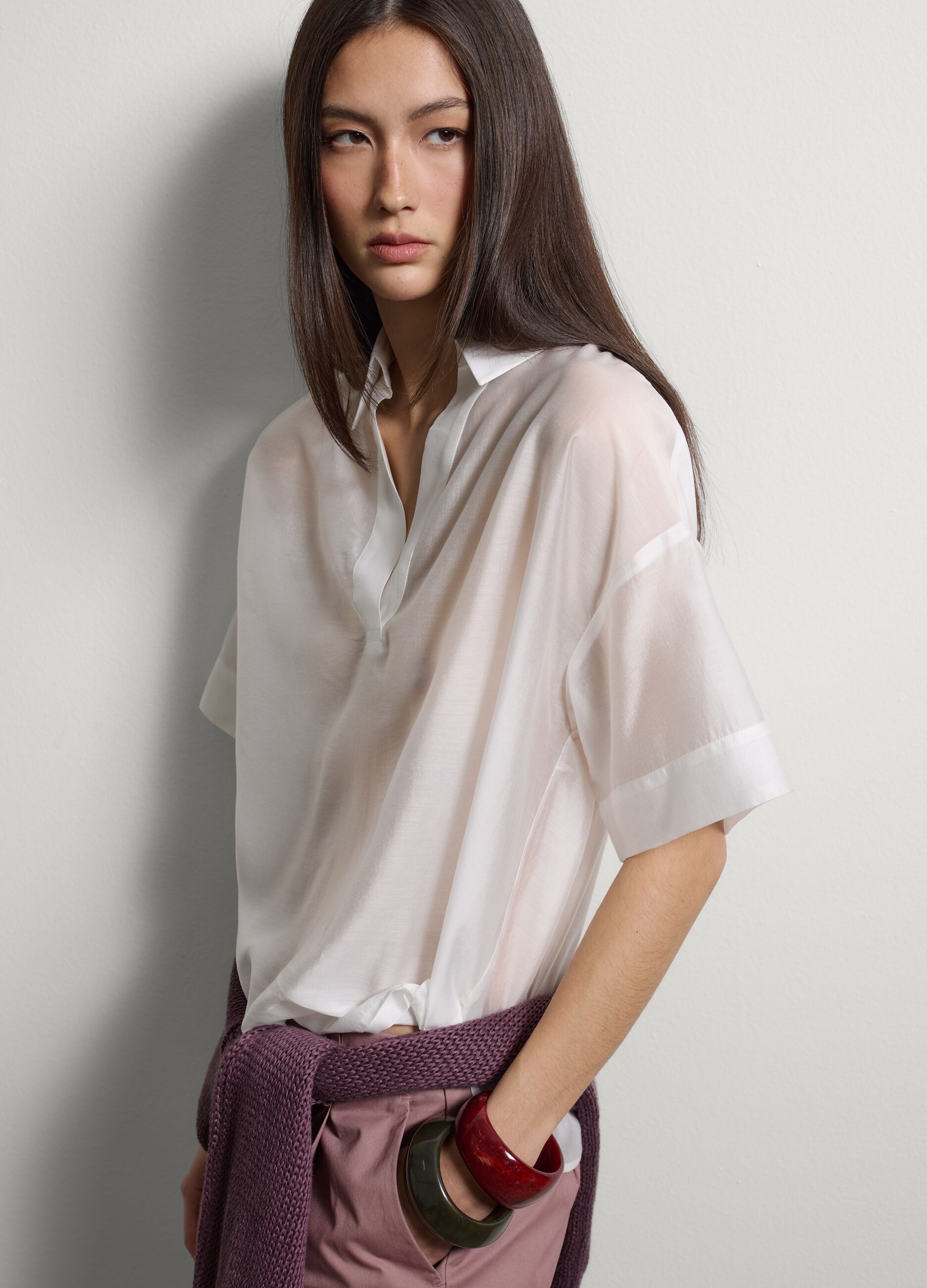 Beyaz lyocell karışımlı gömlek yaz için mükemmel. Klasik yakalı ve normal kesimli tasarımı rahatlık ve çok yönlülük sunuyor. Şık ve günlük görünümler için ideal olan bu gömlek, hafif kumaşı sayesinde sıcak günlerde ferahlık sağlıyor