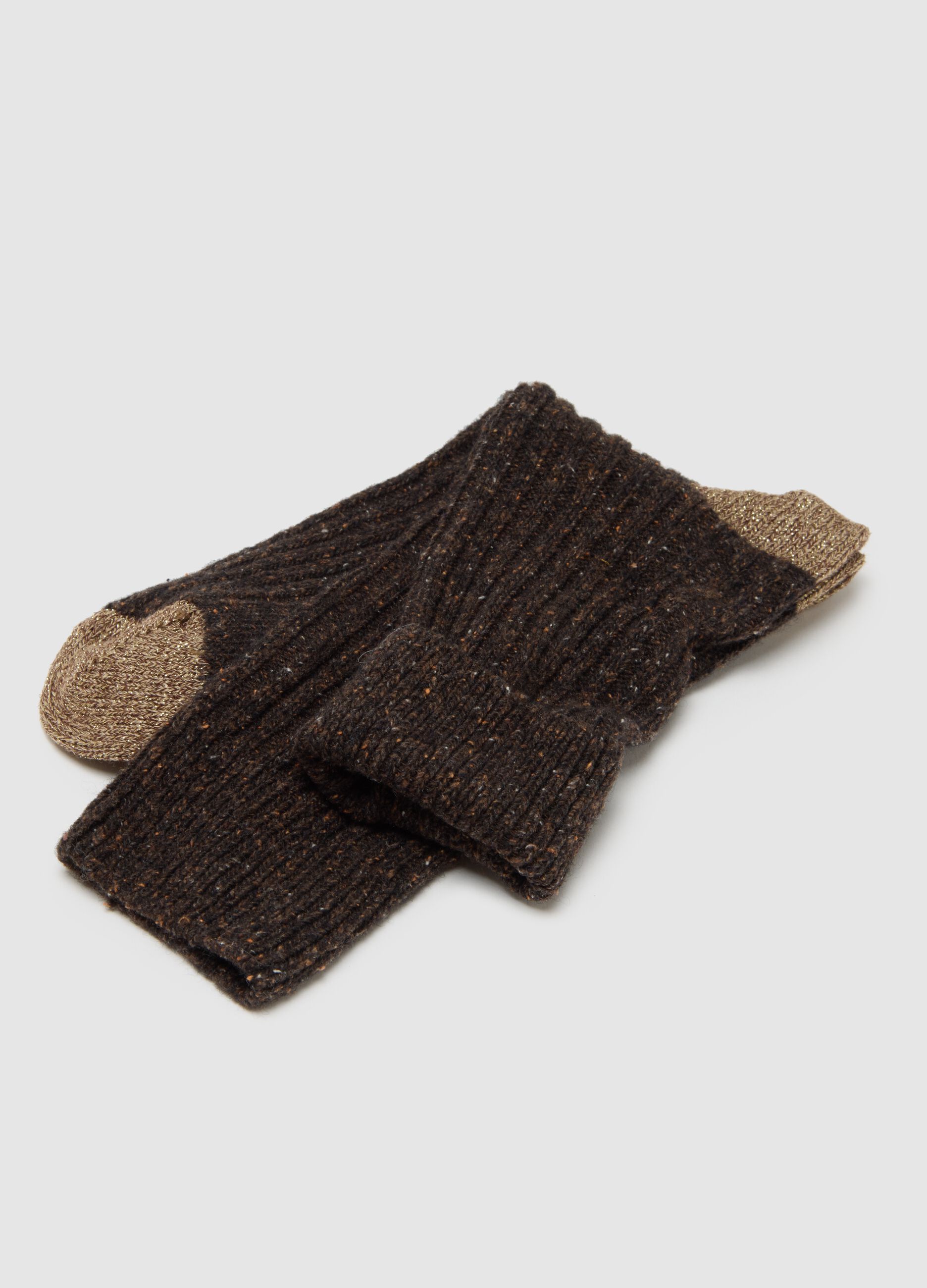 çoraplar, soğuk mevsim için mükemmel olan sıcaklık ve yumuşaklığı sağlayan yün karışımı bir malzemeden üretilmiştir. Kahverengi detaylarla çok renkli tasarımı, sonbahar ve kış kıyafetlerinize şıklık katıyor. Bu çoraplar, özgünlükten ödün vermeden konfor ve pratiklik arayanlar için idealdir.