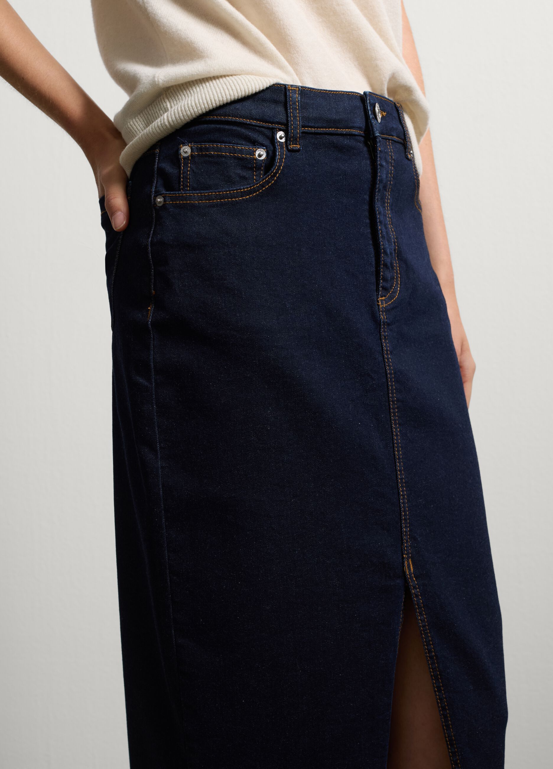 Esnek pamuktan üretilmiş, çok yönlü ve rahat bir giysi olan mavi etek, midi boyuyla feminen ve sofistike bir silüet sunarken, denim detaylarıyla da zenginleştirilmiştir. Şık bir bluz veya günlük bir tişörtle kombinlendiğinde her türlü duruma uygun olan bu model, birçok kıyafetle uyum sağlayabilme özelliği sayesinde gardırobunuzun olmazsa olmazlarından biridir.