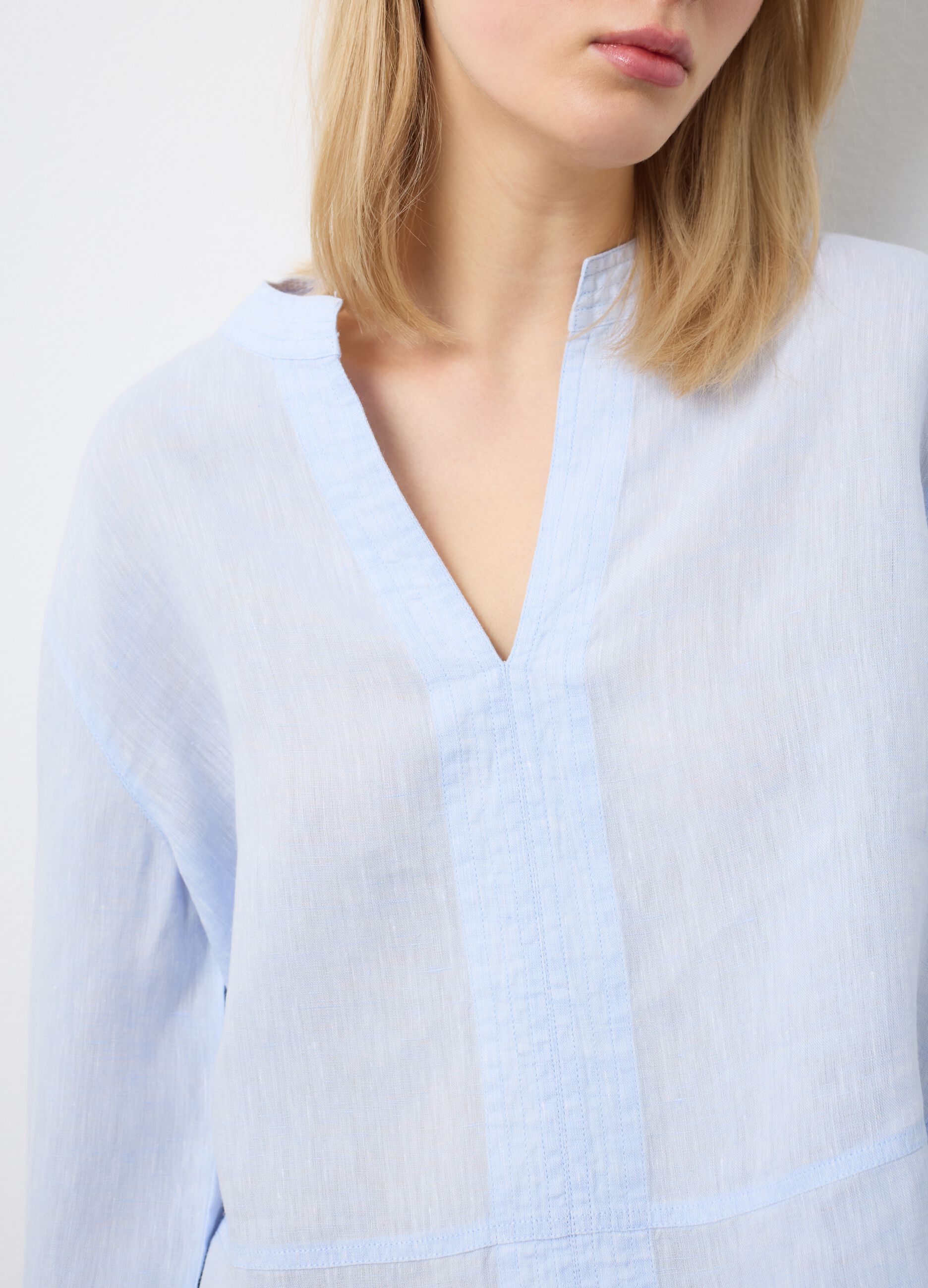 Gök mavisi gömlek, ferahlık ve hafiflik sağlayan saf ketenden üretilmiştir. Yuvarlak yakalı ve düğmeli normal kesim tasarımı, yaz için ideal, rahat ve şık bir tarz sunar. Her türlü etkinlik için mükemmel olan bu gömlek, kadın gardırobunun olmazsa olmazlarından biridir.