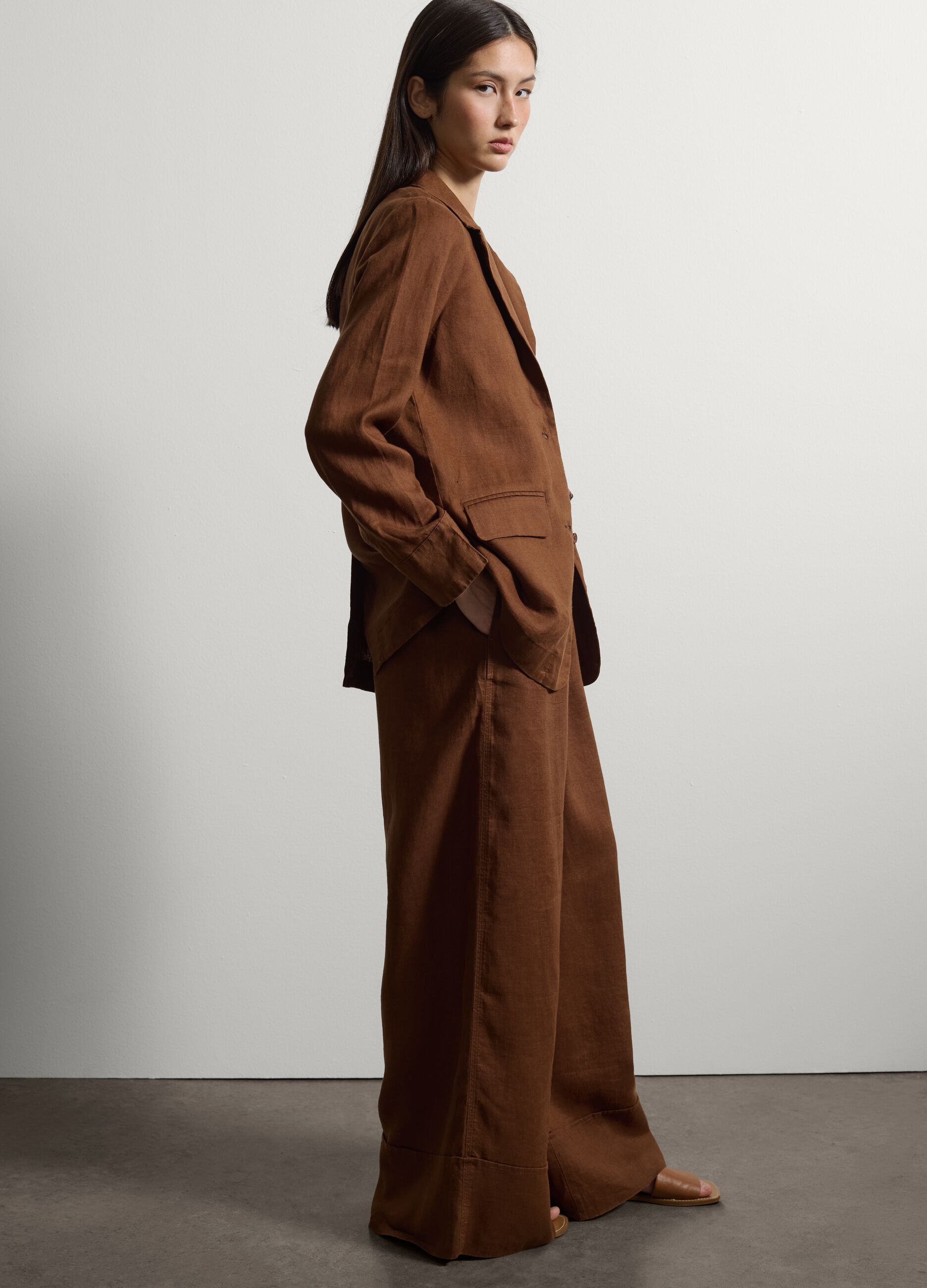 Yaz mevsiminde optimum konfor için saf ketenden üretilmiş bu zarif kahverengi blazer ceketi keşfedin. Normal kesimi ve astarsız yapısı, rahat bir görünüm sağlarken, düğmeleri ve cepleri günlük görünümünüze pratiklik katıyor. Klasik tasarımı ve standart yakasıyla her kıyafeti mükemmel bir şekilde tamamlayarak tarzınıza şıklık ve zarafet katıyor.