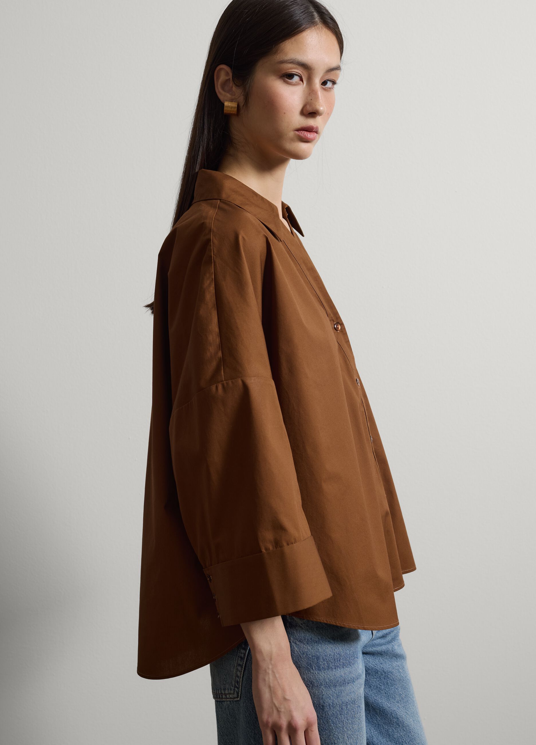 Kahverengi gömlek, ilkbahar-yaz sezonu için ideal olan saf pamuktan üretilmiştir. Bol kesimi ve klasik tasarımı, düğme kapaması ve geleneksel yakasıyla dikkat çekiyor. Üç çeyrek kolları, şık ve günlük görünümler için mükemmel bir kullanım kolaylığı sunuyor. Pantolon veya eteklerle kolayca kombinlenebilen çok yönlü bir parça olup, sofistike kıyafetler oluşturmanızı sağlar.
