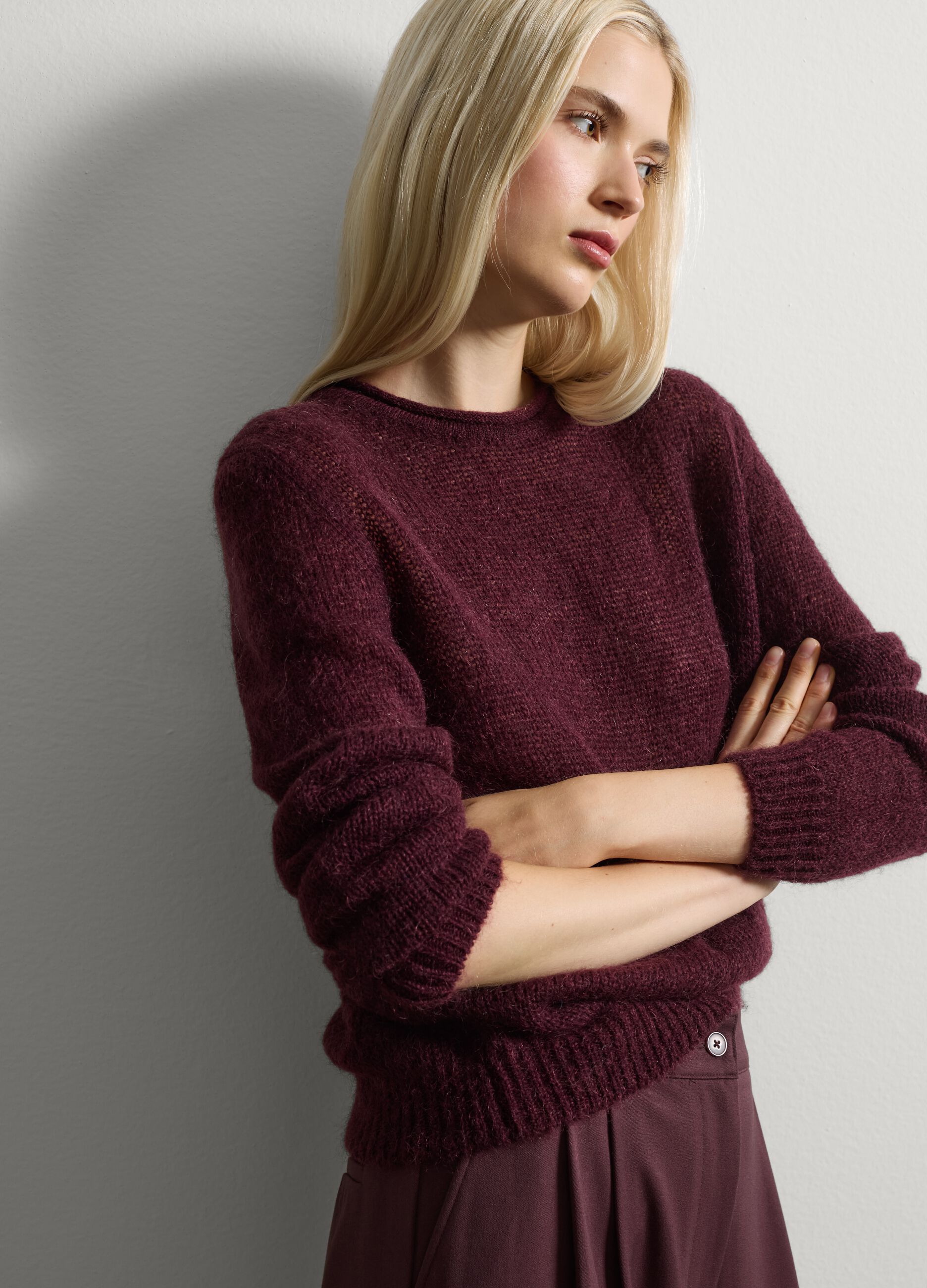 Bordo kazak, şıklık ve rahatlığı bir arada sunuyor. Yumuşak dokulu, tiftik ve yün karışımından üretilmiştir. Normal kesim ve yuvarlak yakaya sahip bu kazak, sıcak ve şık kombinler oluşturmak için mükemmeldir ve mükemmel giyilebilirlik sağlar.