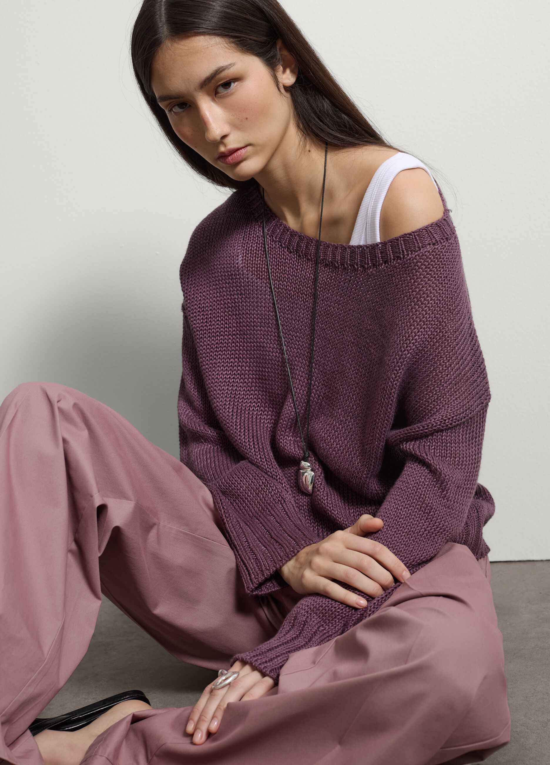 Mor kazak, ilkbahar ve yaz mevsimleri için mükemmel olan saf ketenden üretilmiştir. Normal kesimi ve düğmesiz tasarımı, rahat ve gündelik bir görünüm sağlar. Yuvarlak yakası ve uzun kollarıyla serin günler için idealdir. Jersey örgü kumaşı yumuşaklık ve konfor sunarak şık bir kombin oluşturmayı kolaylaştırır.