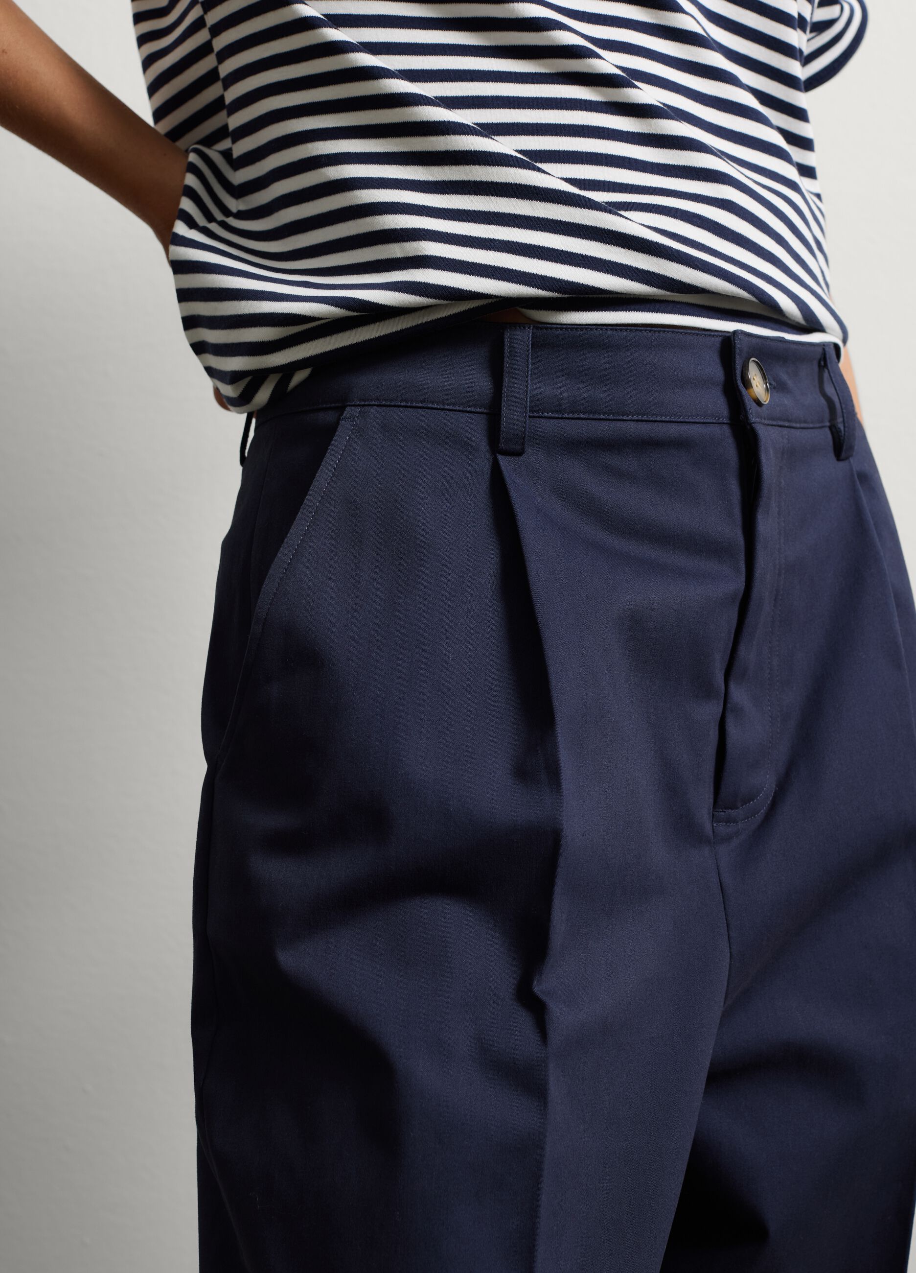 Zarif mavi pamuk karışımı pantolon, sonbahar ve kış mevsimlerinde kıyafetinize şıklık katmak için mükemmeldir. Normal kesimi ve rahat elastik bel bandıyla, stilden ödün vermeden konfor sunar. Düğme ve fermuar kapatması pratiklik sağlar ve her durum için idealdir. Şık ve zarif bir görünüm için kazak veya gömlekle kombinleyebilirsiniz.