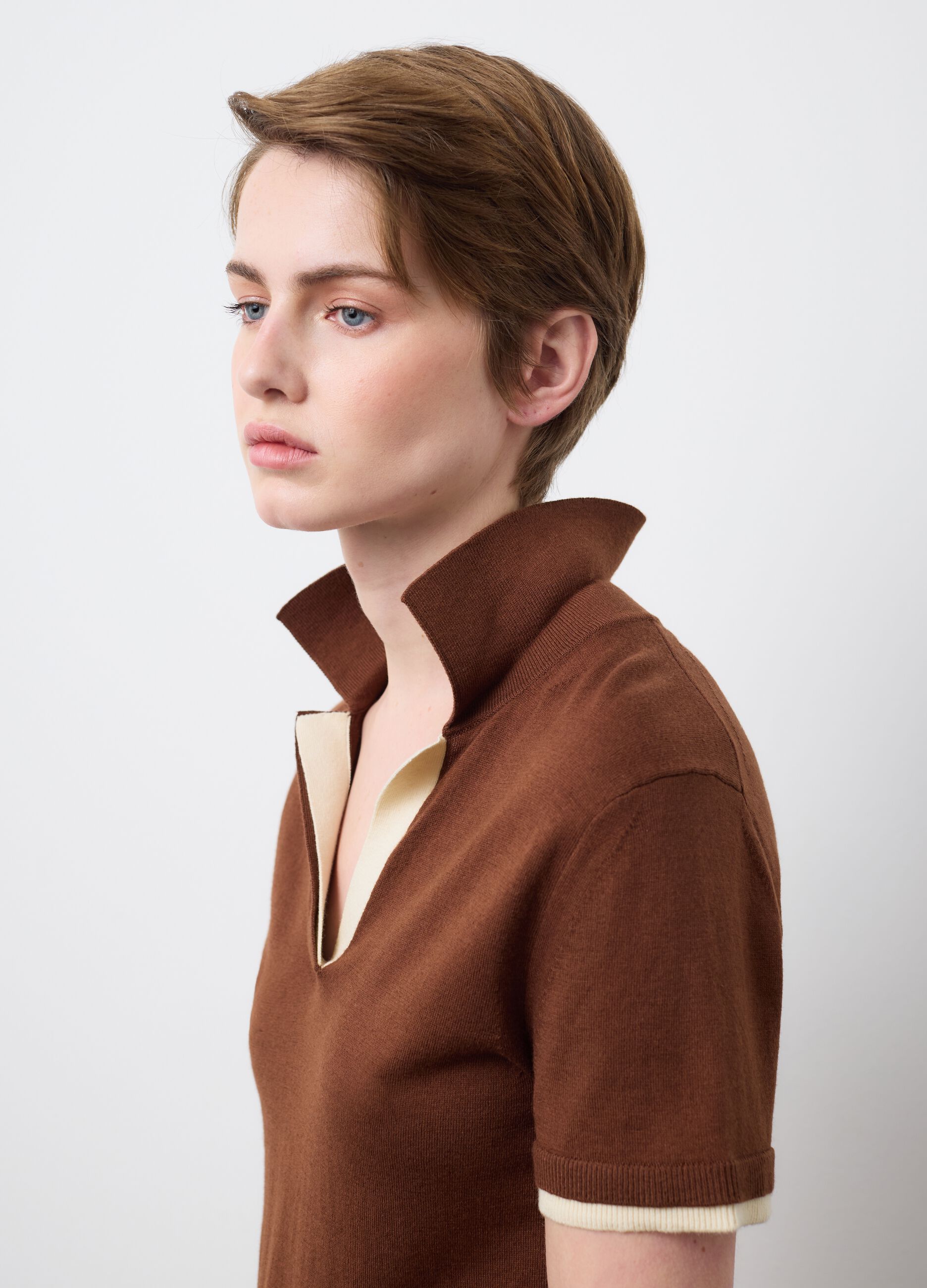 Kahverengi polo yaka kazak, yün, pamuk ve kaşmir karışımından üretilmiş, çok yönlü ve şık bir parçadır. Kısa kollu zarif tasarımı, daha hafif mevsimler için idealdir. Düğmesiz olması ve polo yakası, ona modern ve sofistike bir görünüm kazandırır. Bu kazak, rahatlıktan ödün vermeden günlük bir görünüm yaratmak için mükemmeldir.