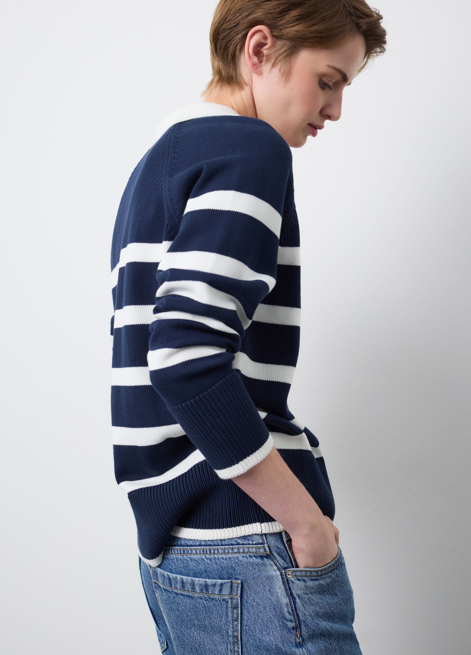 Beyaz çizgili bu mavi kazak, olağanüstü konfor ve yumuşaklık sağlamak için saf pamuktan üretilmiştir. Polo yaka tasarımı, mevsim geçişlerinde giymek için ideal olan sportif bir dokunuş katmaktadır. Normal kesim ve uzun kolları, bu giysiyi pratiklik ve stil arayanlar için mükemmel kılmaktadır.
