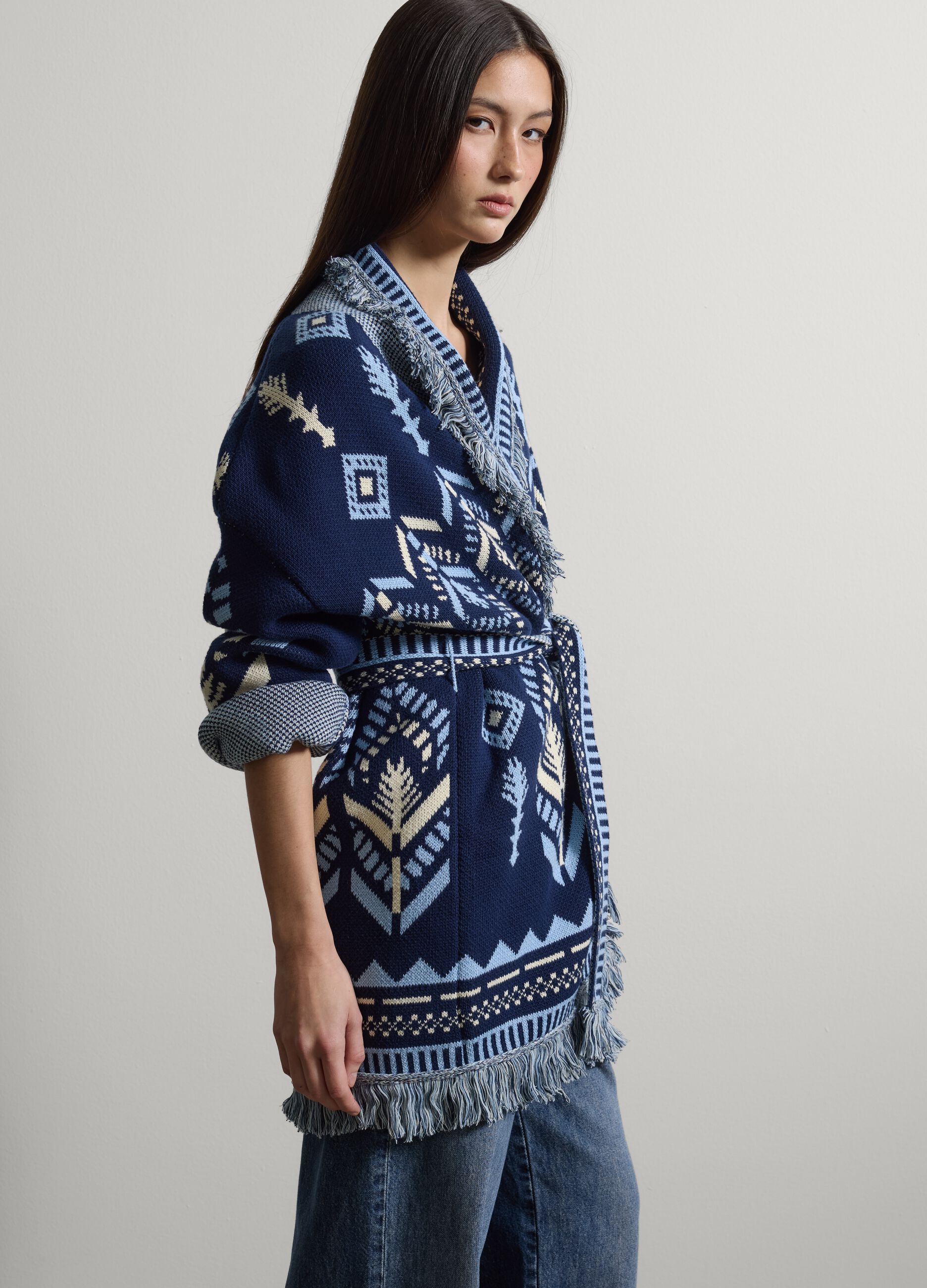 Mavi ve beyaz saf pamuk hırka, ilkbahar-yaz ayları için idealdir. Bol kesimi, geometrik deseni ve yan kısımlarındaki püskülleriyle konfor ve şıklığı bir arada sunar. Kemerli bu parça, yuvarlak yakası ve uzun kollarıyla kıyafetlerinize şıklık katmak için mükemmeldir.