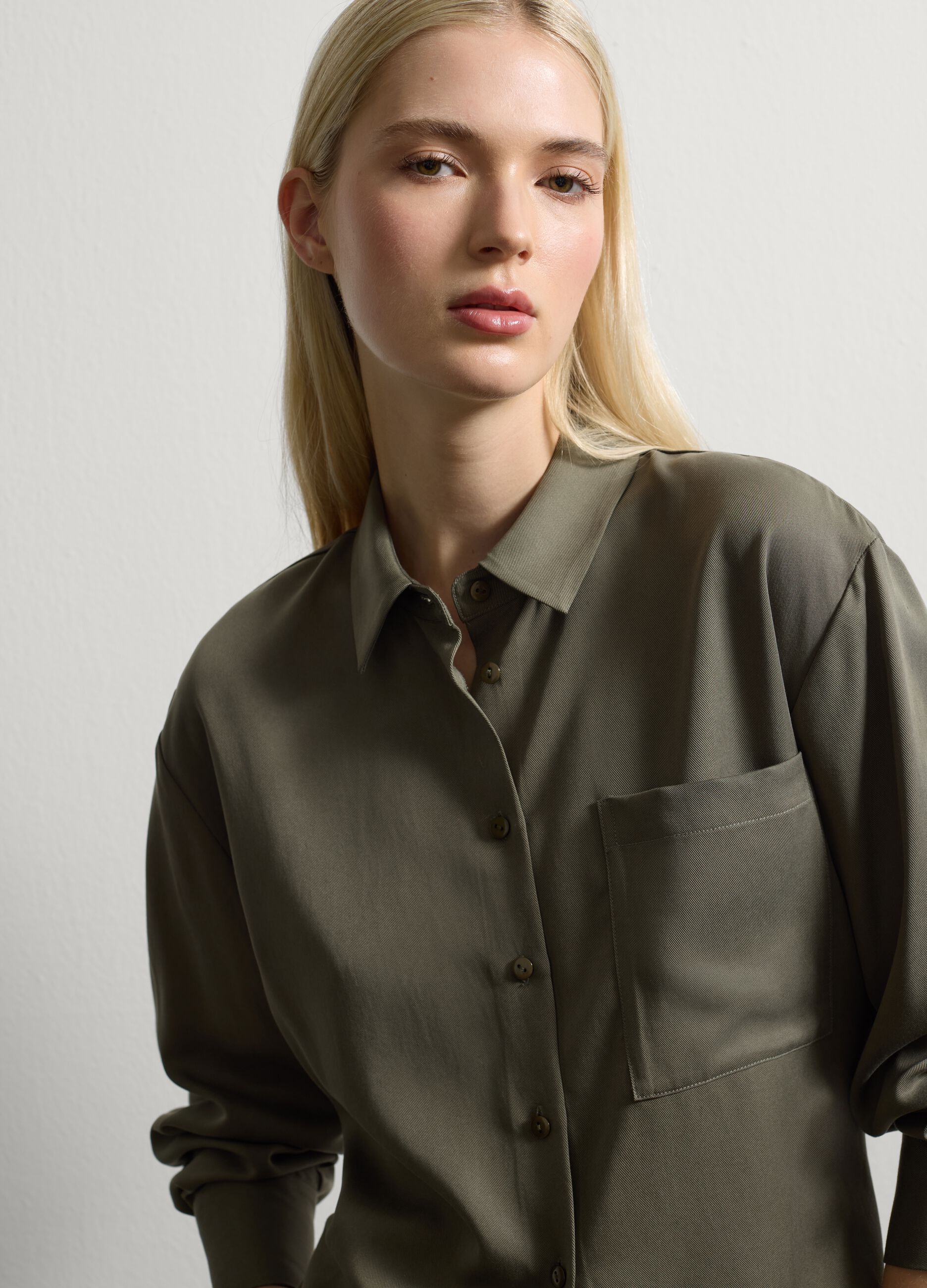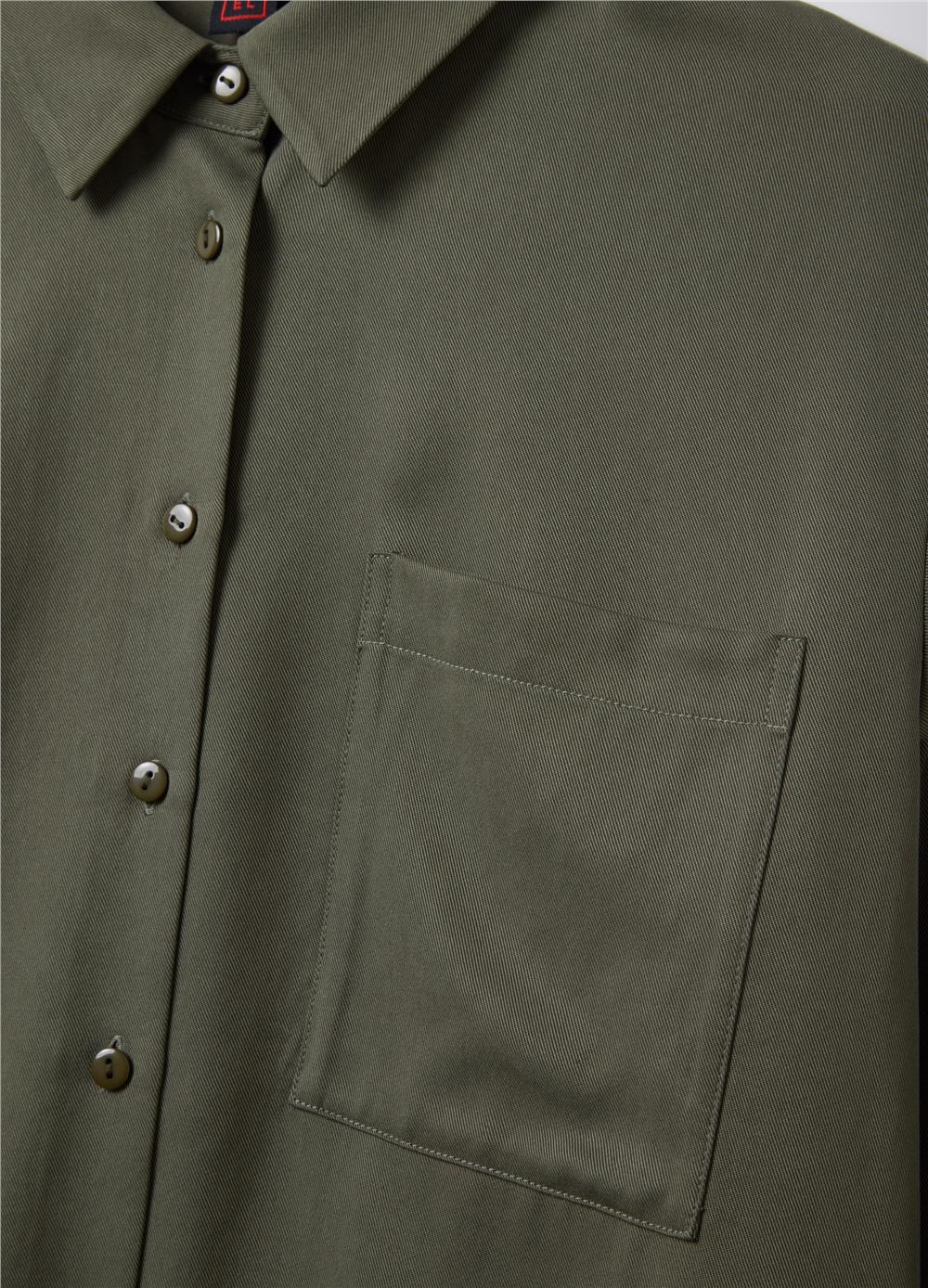 Yeşil, saf Lyocell kumaştan üretilmiş gömlek, sonbahar mevsimi için mükemmel. Klasik yakası ve uzun kollarıyla rahatlık ve kullanışlılık sağlayan normal kesime sahip. Hem rahat hem de şık bir görünüm için ideal olan bu gömlek, kusursuz bir kombin için en sevdiğiniz pantolonlarla kolayca eşleştirilebilir. Zarif ve çok yönlü bir stili seven her kadın için olmazsa olmaz bir parça.