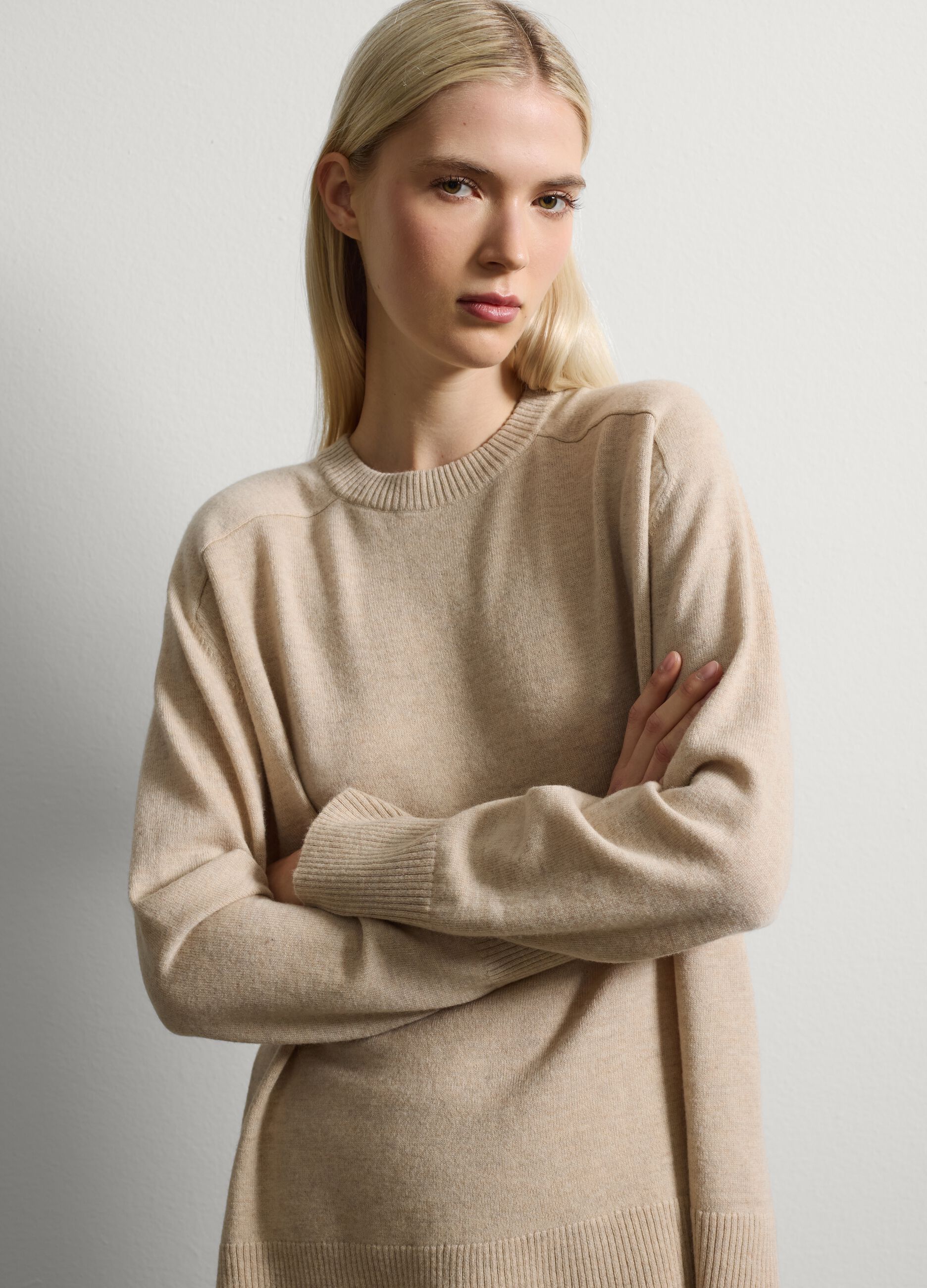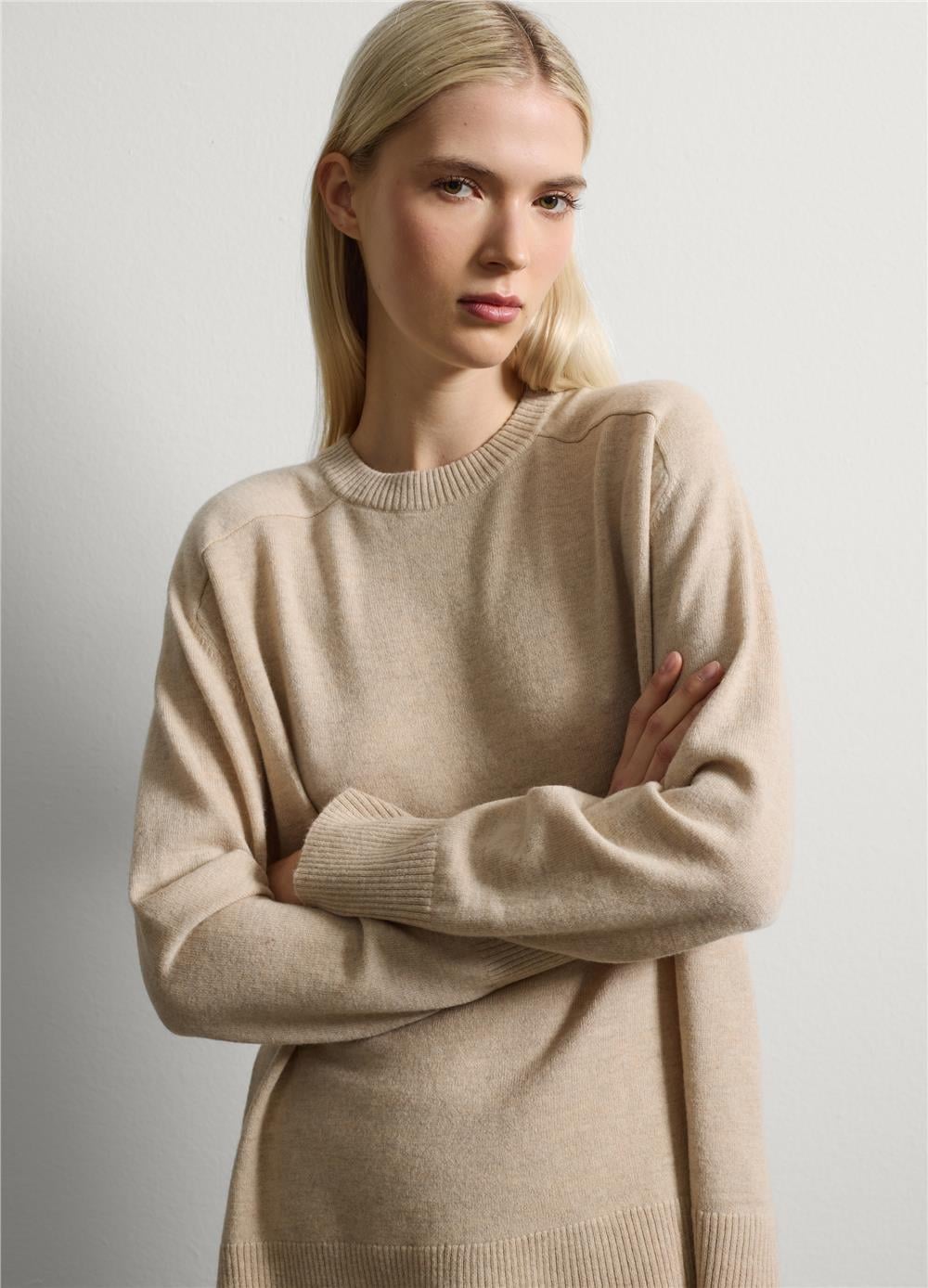 Saf yün bej kazak, sonbahar/kış mevsiminde sıcaklık ve konfor sağlamak için tasarlanmıştır. Klasik yuvarlak yakalı ve uzun kollu bu kazak, gardırobunuza çok yönlü ve zamansız bir katkı sağlar. Jersey örgü kumaşı yumuşaklık ve normal kesim sağlar; hem günlük hem de şık kombinler için mükemmeldir.
