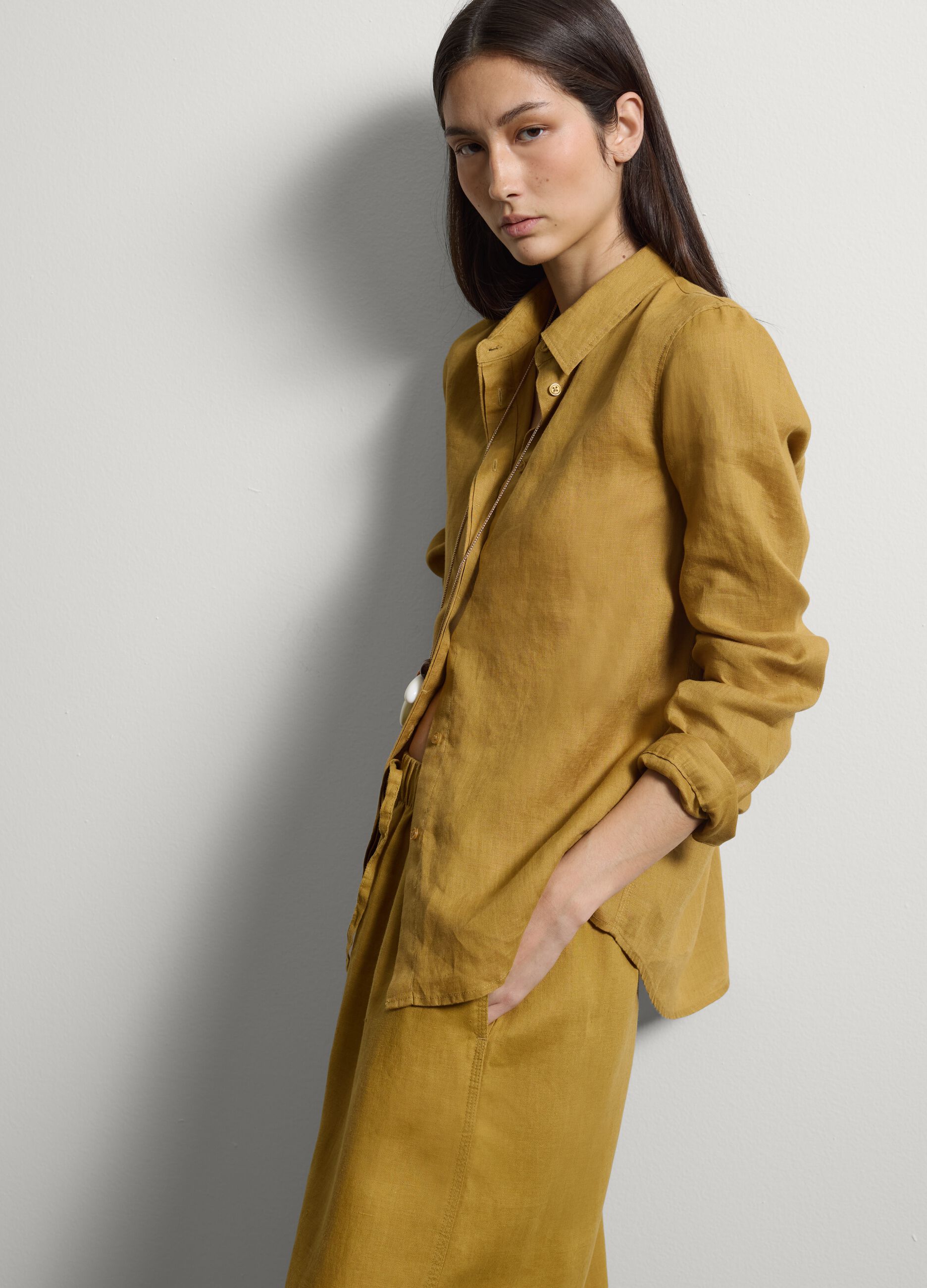 Sarı renkli, saf keten gömlek, sıcak mevsim için ideal bir giysidir. Hafif ve nefes alabilir yapısıyla yaz günlerinde konfor sağlar. Klasik yakası ve uzun kollarıyla zarif bir tasarıma sahip olan gömlek, gündelikten daha şık ortamlara kadar çeşitli etkinliklere uygundur. Gizli düğme kapatma pratiklik sağlarken, normal kesim hareket özgürlüğü sunar.