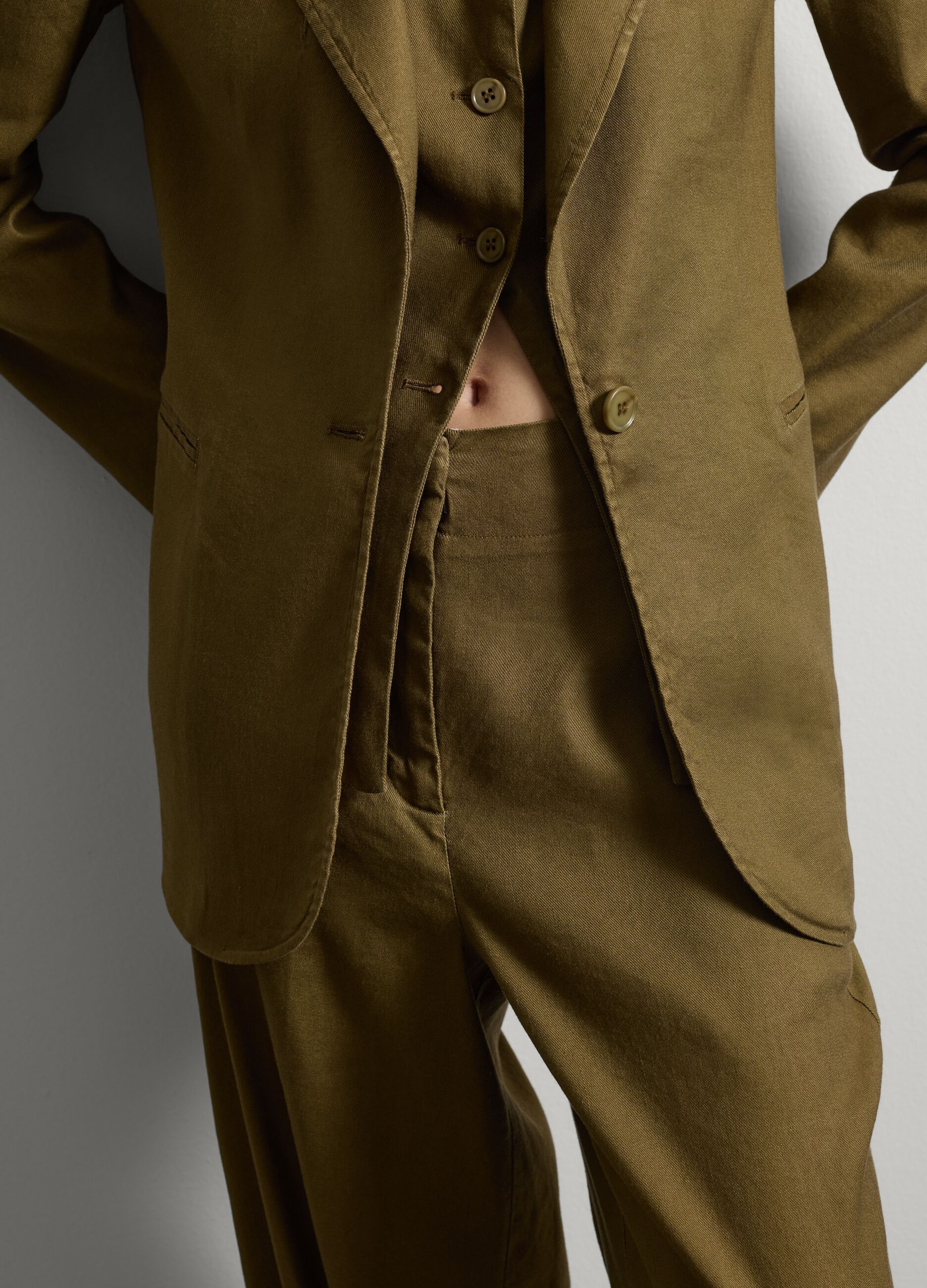 Yeşil blazer ceket, ilkbahar-yaz sezonunun olmazsa olmaz parçalarından biridir. Esnek keten ve viskoz kumaştan üretilen ceket, konfor ve şıklık sunar. Düğmeli kapama ve klasik yaka, kısmi iç astar ile tamamlanarak hafiflik ve kullanışlılık sağlar. Kıyafetlerinizi şıklık dokunuşuyla tamamlamak için mükemmeldir.