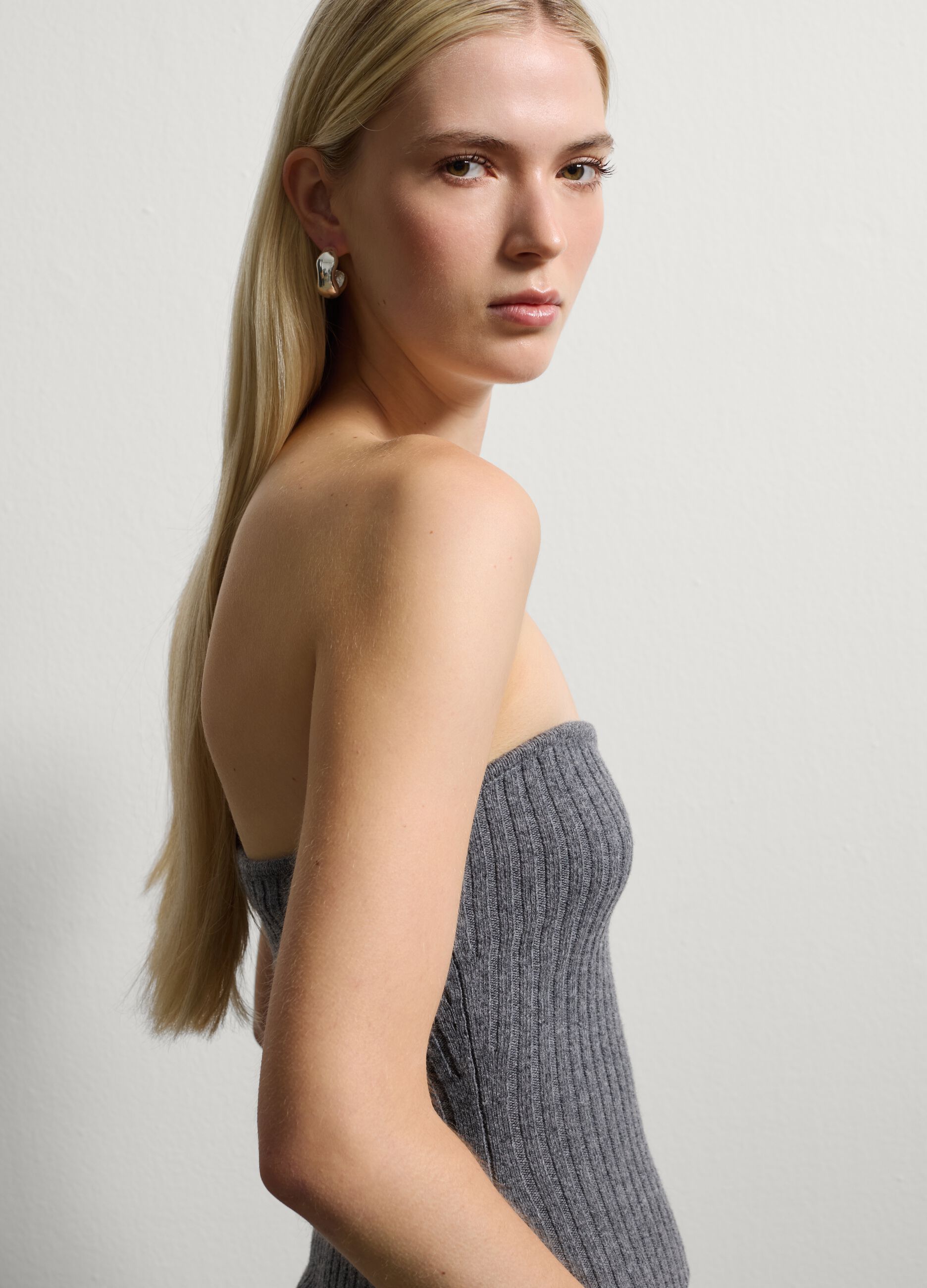 Gri bluz, serin sonbahar akşamları için ideal bir parçadır; esnek yün kumaşı sayesinde sıcaklık ve konfor sağlar. Askısız tasarımı modernlik ve çok yönlülük katar, çeşitli kıyafet stilleriyle mükemmel uyum sağlar. Vücuda mükemmel şekilde oturan, rahat bir kesim sunar.